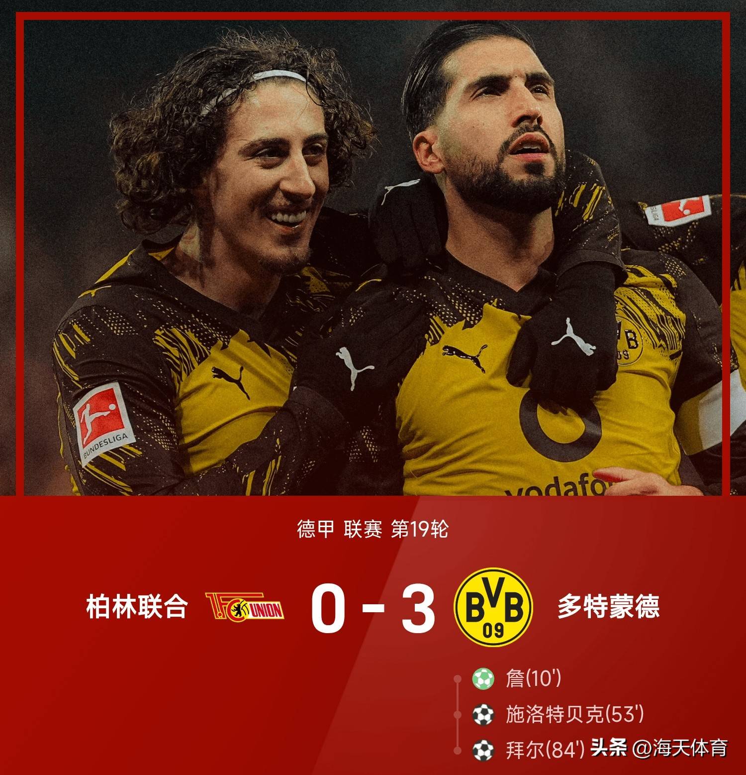 25/26赛季德甲联赛第19轮,柏林联合坐镇主场迎战多特蒙德。此上半场,第10分钟,吉拉西禁区被门将绊倒制造点球,詹主罚命中梦幻开局。席尔瓦门前造险但均未取得进球。下半场易边再战,第53分钟,施洛特贝克头球破门扩大优势。最后阶段第84分钟,拜尔一记贴地斩低射破门锁定战局。最终,多特蒙德3-0大胜柏林联合。目前多特落后拜仁8分,领先第三名霍芬海姆6分。