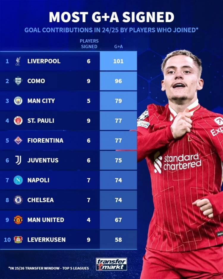 直播吧7月26日讯 德国转会市场统计了五大联赛球队今夏新援上赛季的参与进球数据,利物浦6名新援上赛季共制造101球,排名第一。